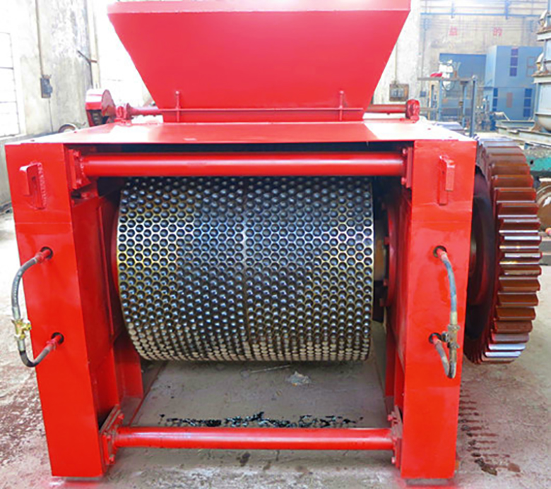 工作原理:通過減速機將動力同時傳遞給兩個壓輥,并使兩個壓輥相向轉(zhuǎn)動,在兩個壓輥轉(zhuǎn)動中,物料自然進入壓輥上的球模中,隨著壓輥的轉(zhuǎn)動,物料承受的壓力有小變大,當(dāng)物料轉(zhuǎn)動到兩輥的線接觸點時,物料承受的壓力已達(dá)到峰值。在巨大線壓力的作用下,物料由粉狀成為成品球。